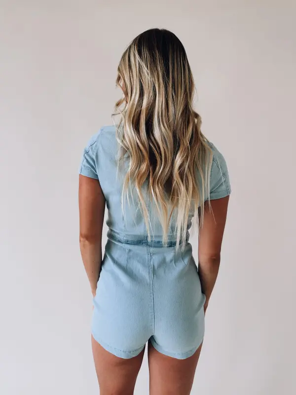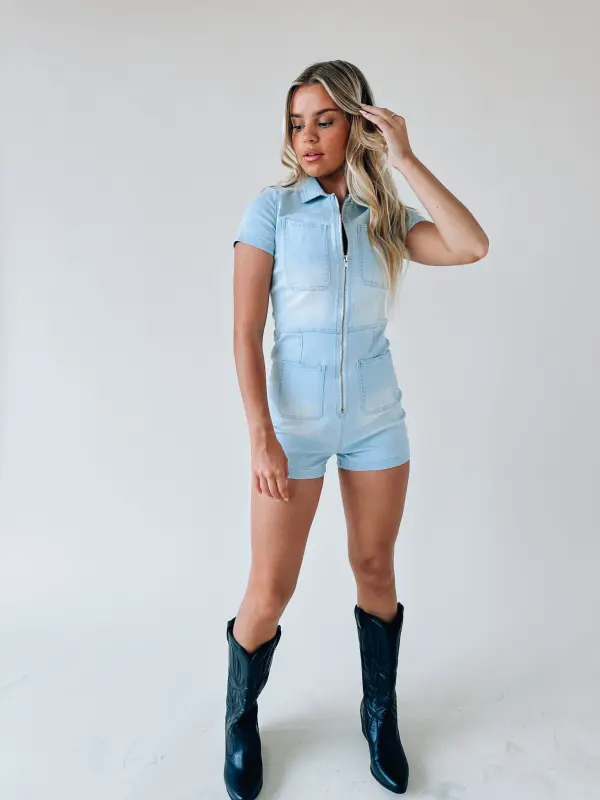 Our Brittany Zip-Up Denim Romper is a short sleeved collared item with a zip-up front closure. There are four patch pocket details on the upper and lower parts of this romper. The fabric on this romper has a very good stretch to it which will be comfy while being worn! This would look so cute paired with some cowboy boots!