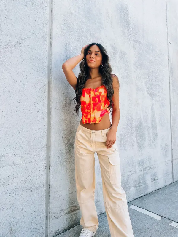 Our Cream Denim Cargo pantts are a high rise denim cargo pant that is perfect for summer. These bottoms feature a high/mid rise waistline and slightly relaxed silhouette. The pants feature multiple functional  cargo patch pockets, functional belt loops and, a button zipper closure on the front. These denim cargo pants are made of a super lightweight cream colored denim with stretch throughout.