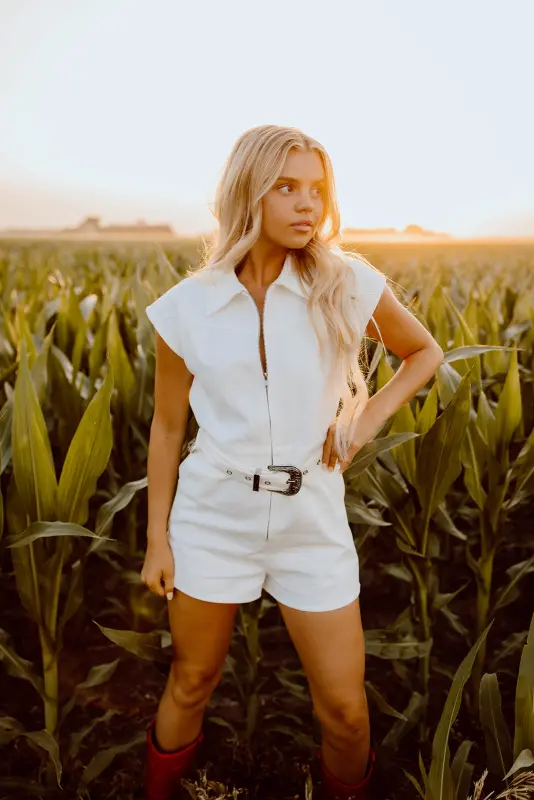 Our Kaila Denim Romper has a belted waist with a loose fit bodice. The belt is a fun added detail with its silver buckle, matching hot pink denim belt strap looping through 5 belt loops along the waist, and it is adjustable to give the silhouette some shape. This romper also has a zipper closure up the front and a collared neck, with front side pockets, and two back pockets as well. This romper has stretch throughout and runs true to size.