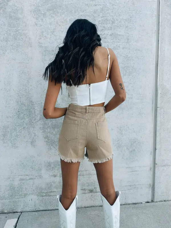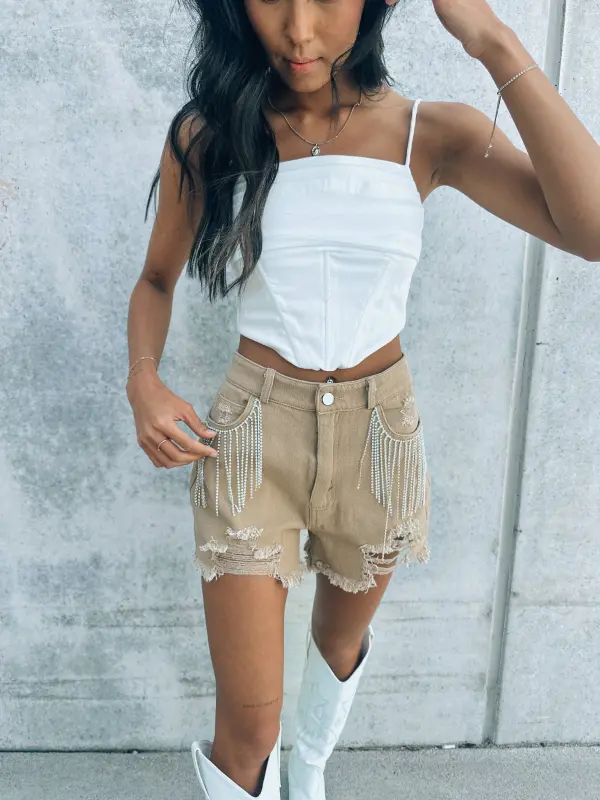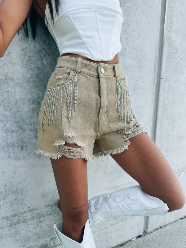 Our Kolby Rhinestone Fringe Shorts a taupe denim short with a high waistline. These taupe denim shorts feature rhinestone fringe on both of the front pockets, distressing throughout, and high waistline. These shorts have some stretch throughout.