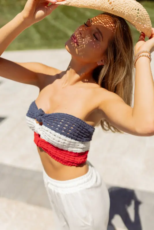 Elevate your summer wardrobe with the Liberty Knit Tube Top. Featuring a striking combination of red, white, and navy colors, this cropped top is designed to make a statement. The three knot detailing in the front adds a touch of charm and uniqueness, while the stretchy fabric ensures a comfortable and flattering fit. Perfect for slipping on, the Liberty Knit Tube Top is your go-to piece for effortless style and versatility.
