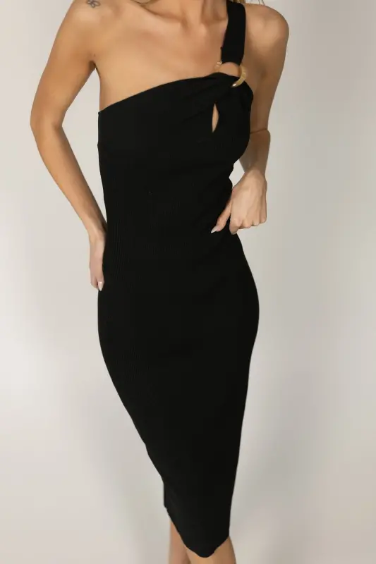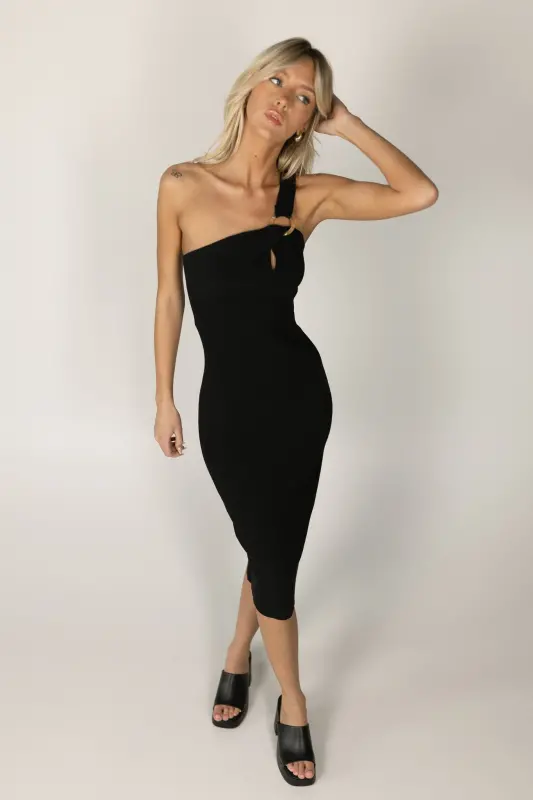 The Savy Black One Shoulder Midi Dress is a sleek bodycon piece that exudes contemporary sophistication. This fitted, strapless dress features a single shoulder strap and a stylish keyhole detail at the center bust. Designed with stretch for a comfortable, flattering fit, this midi dress is the perfect choice for making a bold, elegant statement.